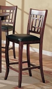 Product Description : Dimension: 18 1/2"L x 20"W x 47"H Finish: Dark Cherry, Black Material: Wood, Leather Like Vinyl Set of 2 29"H Bar Stools Black Leather Like Cherry Finish Features curved front legs and are upholstered in black leather like vinyl. Stylish window pane style backs. Suitable for contemporary style dining room. Item will bring rich elegance and highlight any room in your house. Assemble required.