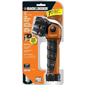 Product Description : From the ManufacturerThe Black & Decker swivel head LED flashlight has a spot to flood adjustable beam and 160 hour run time. Push button switch, easy to turn off and on. It has a durable rubber and polypropylene construction that passes the 7-Foot drop test. It is chemical and oil resistant, material. Two D alkaline batteries included, lifetime warranty.