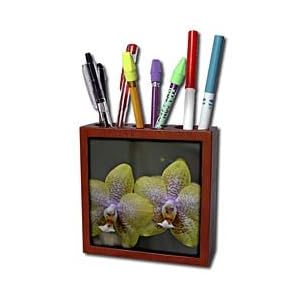Product Description : Two colorful phalaenopsis orchids Tile Pen Holder is great on a desk or counter top. Made of high quality solid wood with a satin finish. Image displayed on one inset high gloss 4.25" x 4.25" ceramic tile. Overall size is 5" x 5" x 1 2/3" with 31 1/3" top holes.