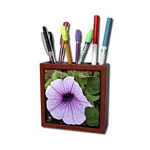 Product Description : Purple garden petunia Tile Pen Holder is measuring 5w x 5h x 2d. Made from high quality solid mahogany wood with satin finish and one 4.25 commercial grade mirror gloss ceramic tile. Looks great on a desk or counter top with a full color custom imaged tile.