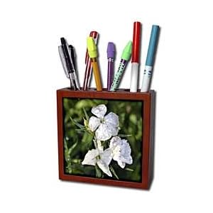 Product Description : White Flowers with Rain Drops Tile Pen Holder is great on a desk or counter top. Made of high quality solid wood with a satin finish. Image displayed on one inset high gloss 4.25" x 4.25" ceramic tile. Overall size is 5" x 5" x 1 2/3" with 3- 1 1/3" top holes.