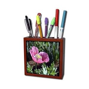 Product Description : Pink Poppy flower in garden Tile Pen Holder is great on a desk or counter top. Made of high quality solid wood with a satin finish. Image displayed on one inset high gloss 4.25" x 4.25" ceramic tile. Overall size is 5" x 5" x 1 2/3" with 3- 1 1/3" top holes.